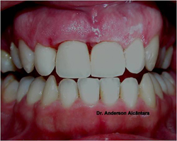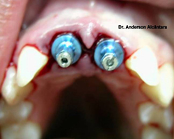 No dia seguinte o paciente volta, removemos o cicatrizador e instalamos a prótese sobre implante provisória. Ela ficará 06 meses em função. Após esse período removemos a provisória e instalamos a definitiva que é confeccionada de porcelana. Neste caso após concluírmos o trabalho o paciente passa fio dental e escova normalmente entre os dentes. |